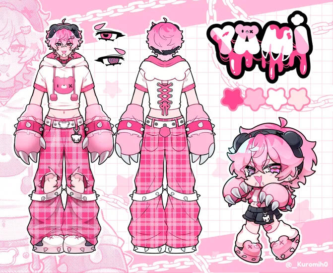 The references should be separated on a single document/character board displaying the poses, clothes, the character itself and other details.